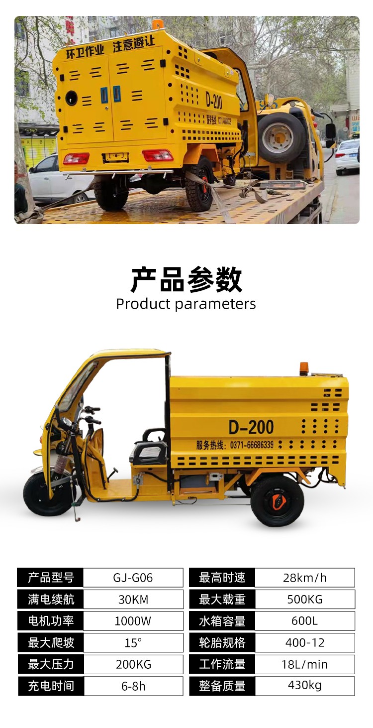 - 潔仕途三輪高壓清洗車 本車適合:清理了墻面、路面、馬路牙子的沖洗等,符合國家新能源,操作簡單。 壓力250公斤;整車尺寸3米*1米*1.3米/12v水箱容積0.6立方汽油發(fā)動機7.5kw/塊V大容量電池