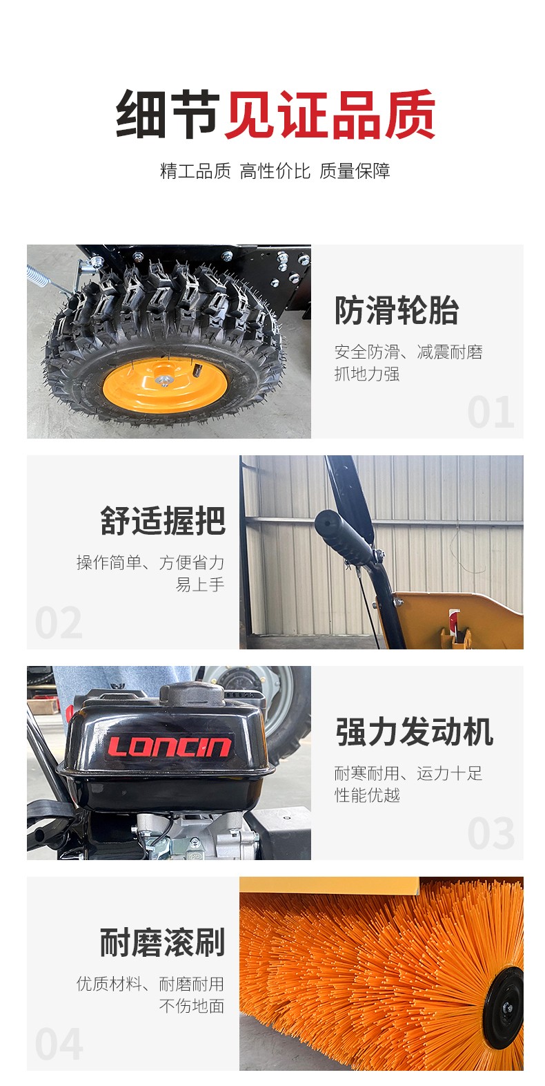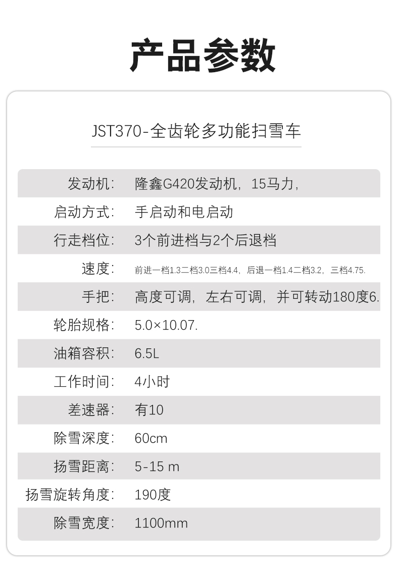 • 1. 發(fā)動(dòng)機(jī):隆鑫G420發(fā)動(dòng)機(jī),15馬力,油箱容積6.5L 2. 啟動(dòng)方式:手啟動(dòng)和電啟動(dòng) 3. 行走檔位:3個(gè)前進(jìn)檔與3個(gè)后退檔 4. 速度(km/h):前進(jìn)一檔1.3二檔3.0三檔4.4, 后退一檔1.4二檔3.2,三檔4.7 5. 手把:高度可調(diào),左右可調(diào),并可轉(zhuǎn)動(dòng)180度 6. 輪胎規(guī)格:5.0×10.0 7. 傳動(dòng)方式:全齒輪直接傳動(dòng) 8. 每箱油工作時(shí)間:約3小時(shí) 9. 差速器:有 10. 除雪寬度: 110cm 11. 除雪深度:60cm 12. 揚(yáng)雪距離: 5-15 m 13. 揚(yáng)雪旋轉(zhuǎn)角度: 190度