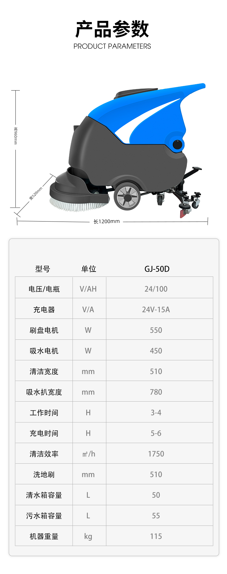 • 適用于:工廠、倉儲、車站、機(jī)場、購物廣場 洗地寬度: 510MM 刷盤: 1個 吸水馬達(dá):24V/450W 刷子馬達(dá):24V/550W 清水箱: 50L 污水箱: 55L 吸耙寬度: 780MM 工作時間:4-6H 工作效率: 1750平方/H