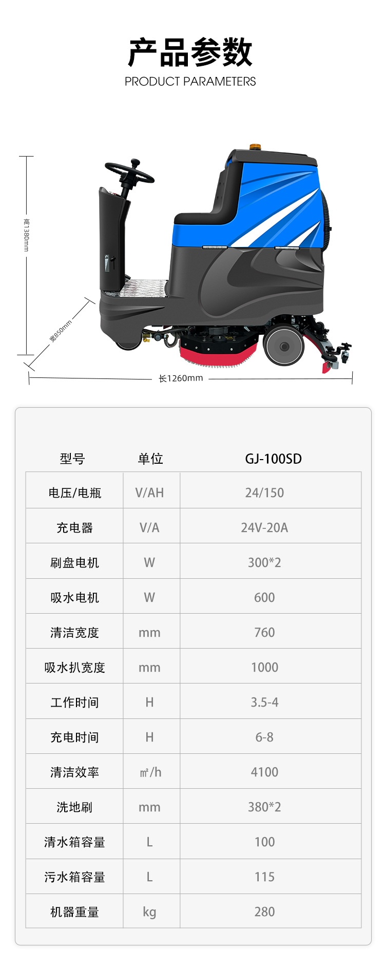 • 潔仕途JST-100SD中型駕駛洗地機(jī) 適用于:工廠、倉儲(chǔ)、車站、機(jī)場(chǎng)、購(gòu)物廣場(chǎng)、停車場(chǎng) 洗地寬度: 760MM 刷盤: 2個(gè) 吸水馬達(dá): 24V/600W 刷子馬達(dá): 2*380W 清水箱: 100L 污水箱: 115L 吸耙寬度: 1000MM 工作時(shí)間: 3-4H 工作效率: 4100平方/H